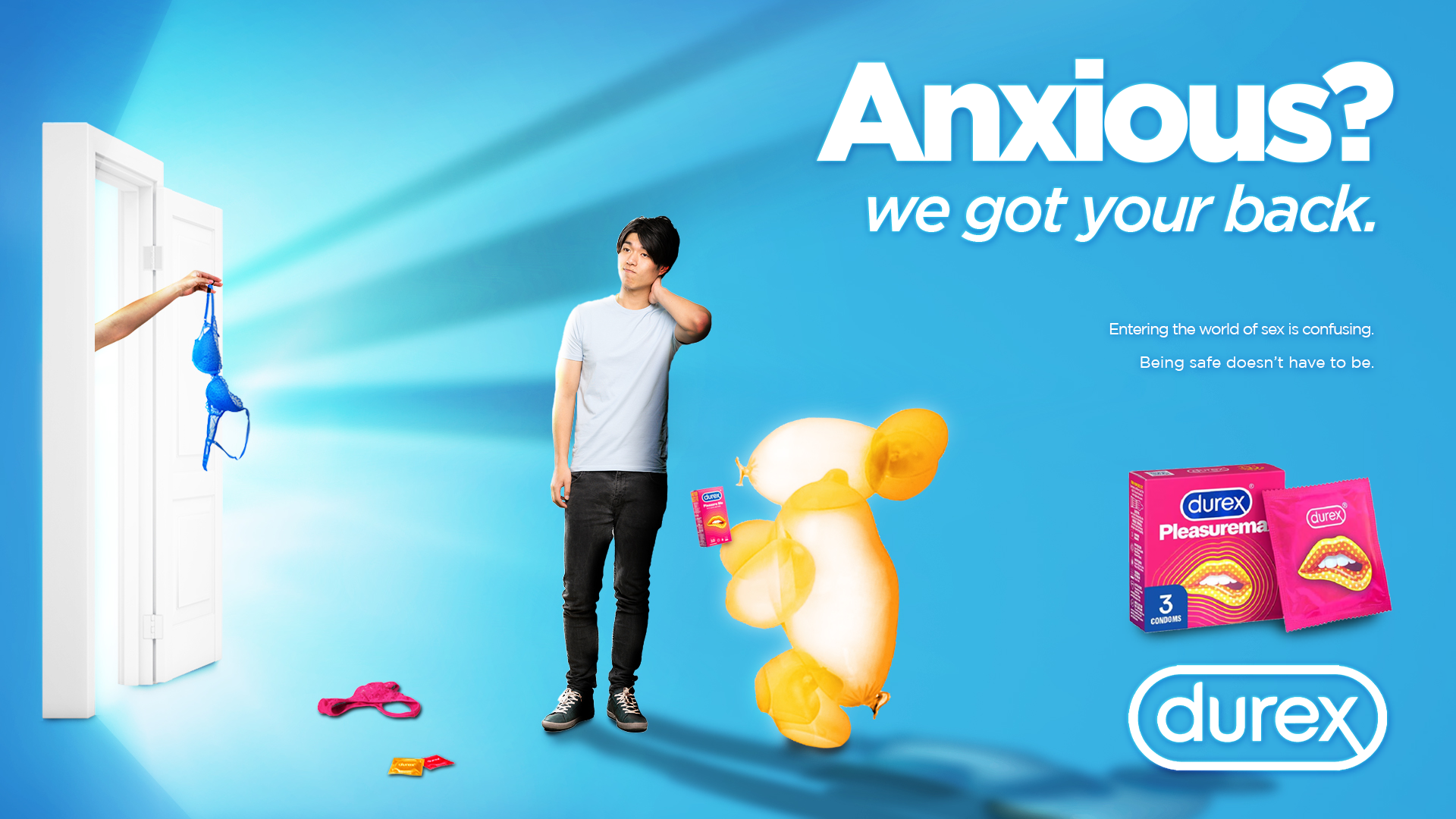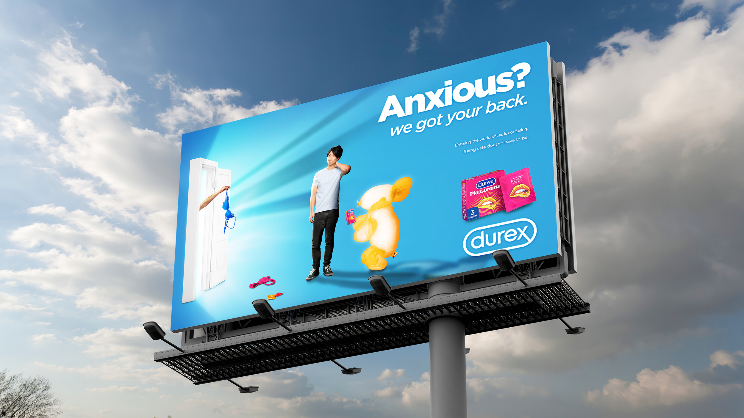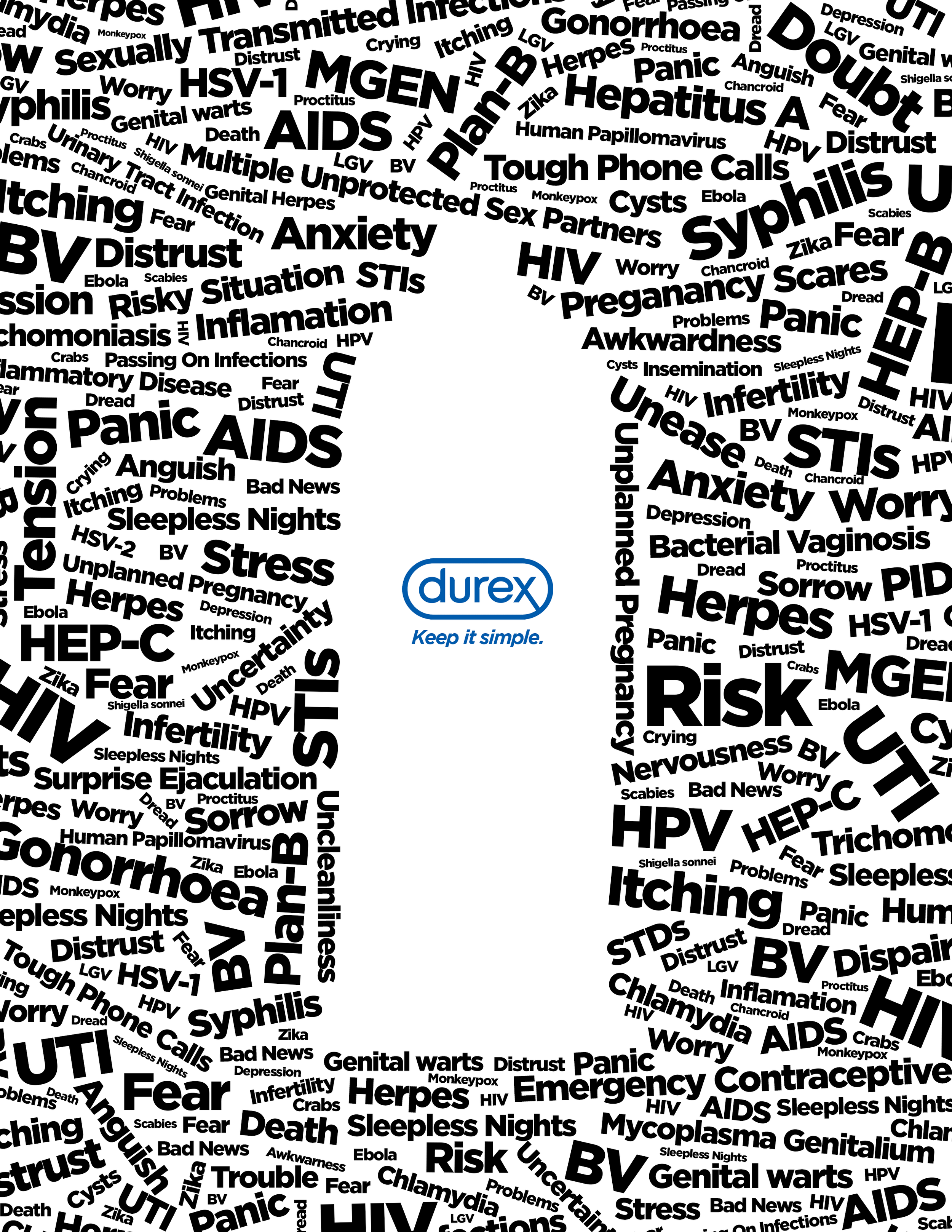 In the first poster, the anxiety fueled fears and dangers that dance through the minds of young adults that are new to the world of sex are positioned outside the walls of the condom. Inside the condom, there is blissful negative space. This is meant to represent the peace of mind that Durex protection provides.