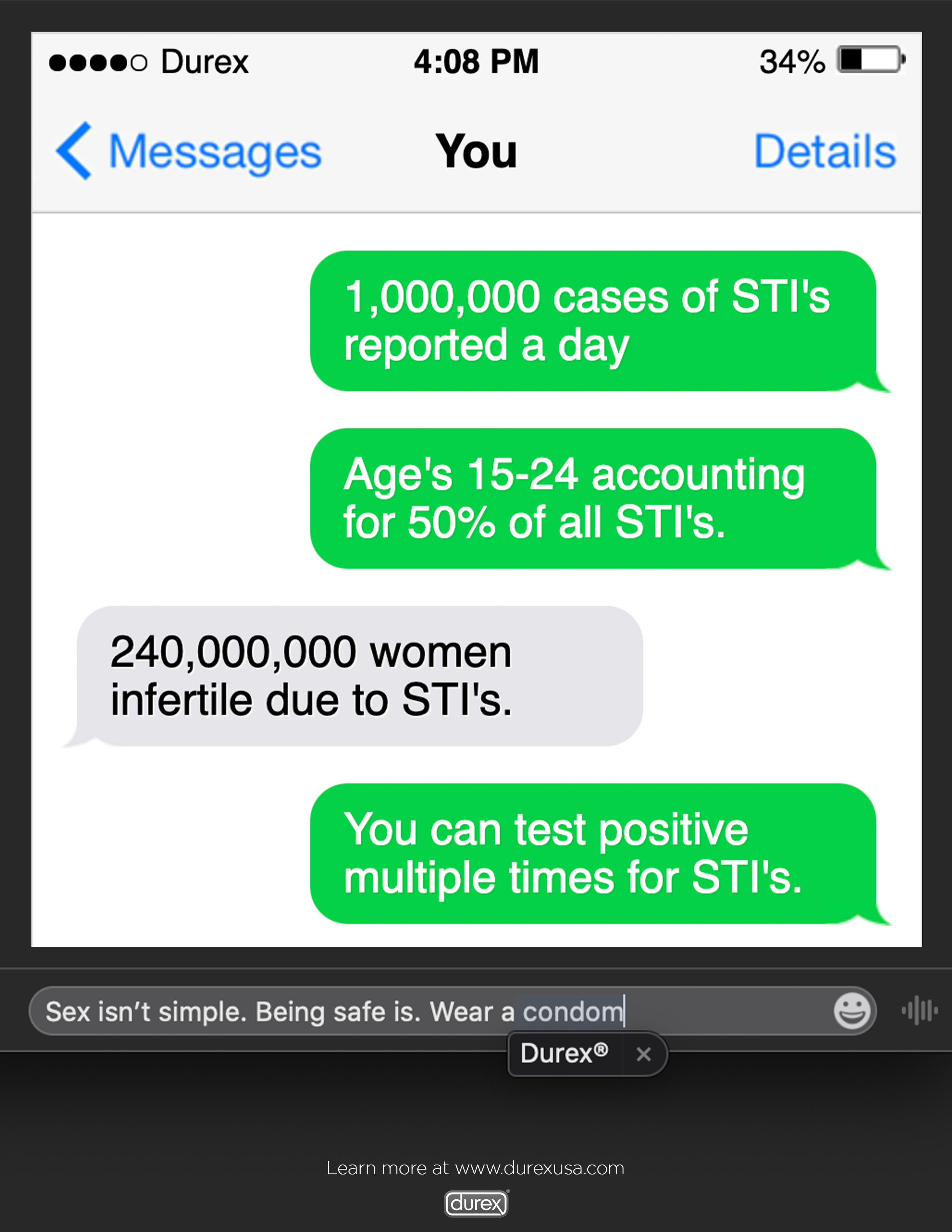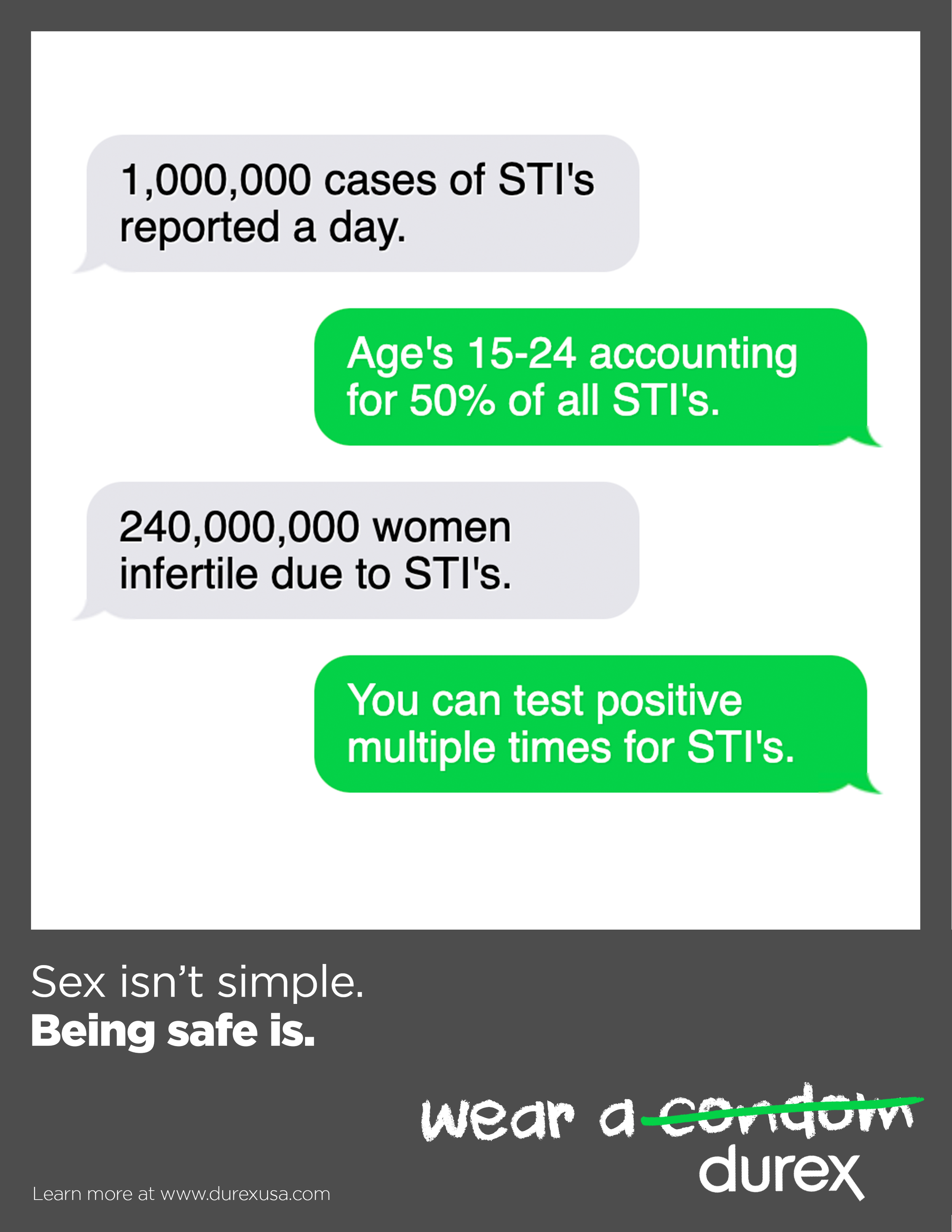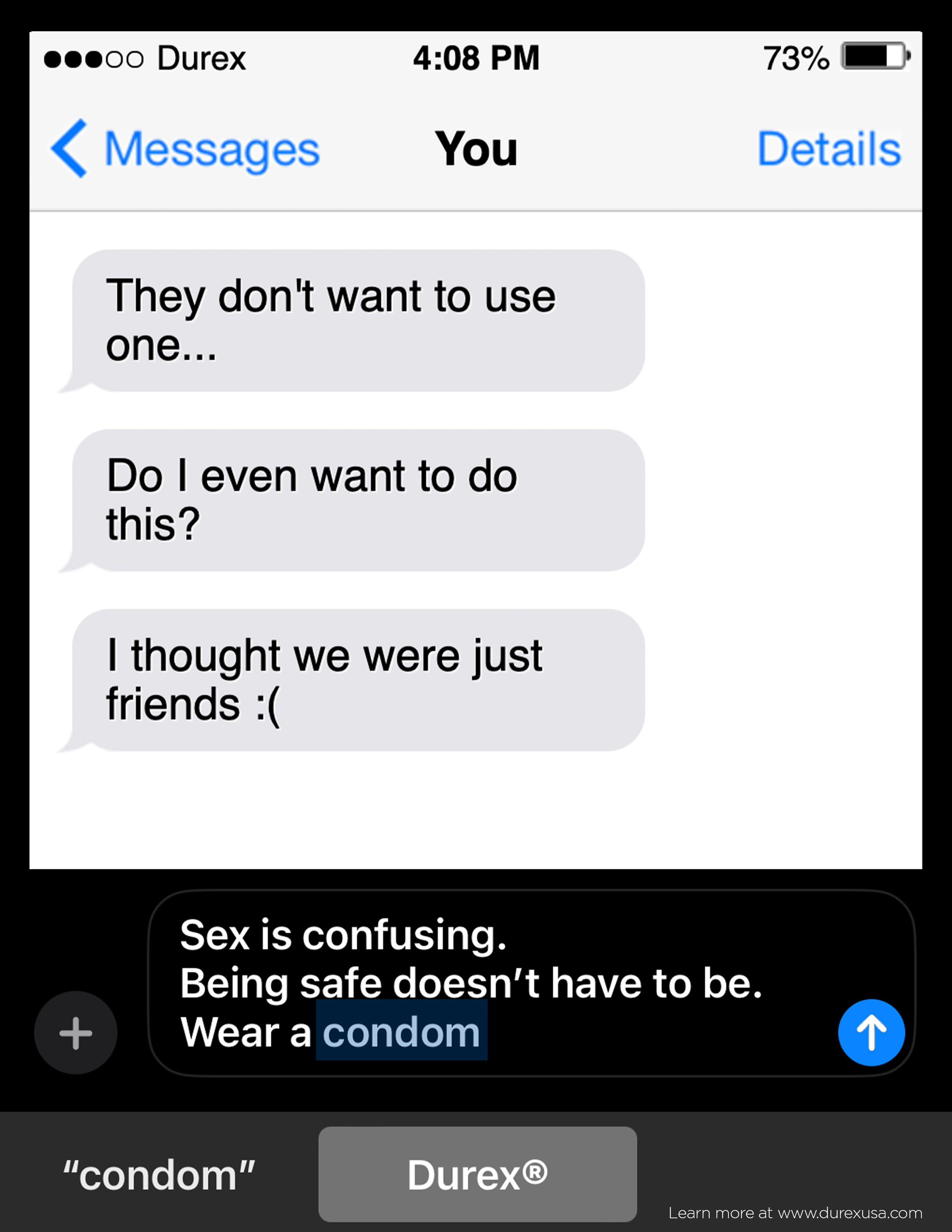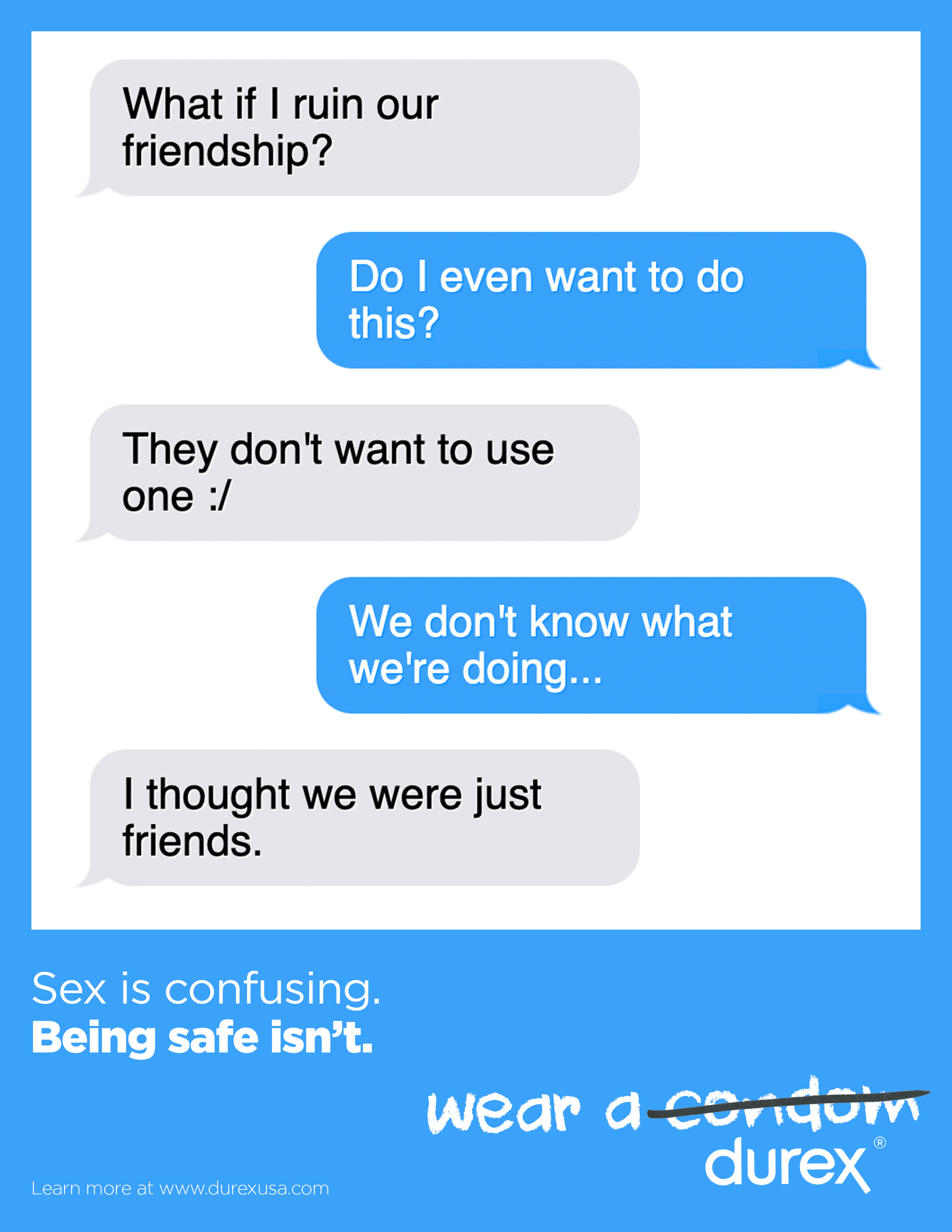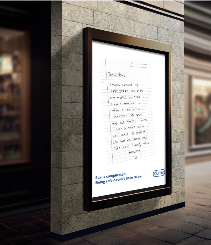 For the third poster, we wanted to fictionalize someone confiding in their close friend after a confusing sexual experience. Throughout the letter, you realize they are speaking directly to the Durex condom that they neglected to use during their encounter. This is meant to display the emotional volatility of becoming sexually active, and position Durex as a shoulder to lean on.