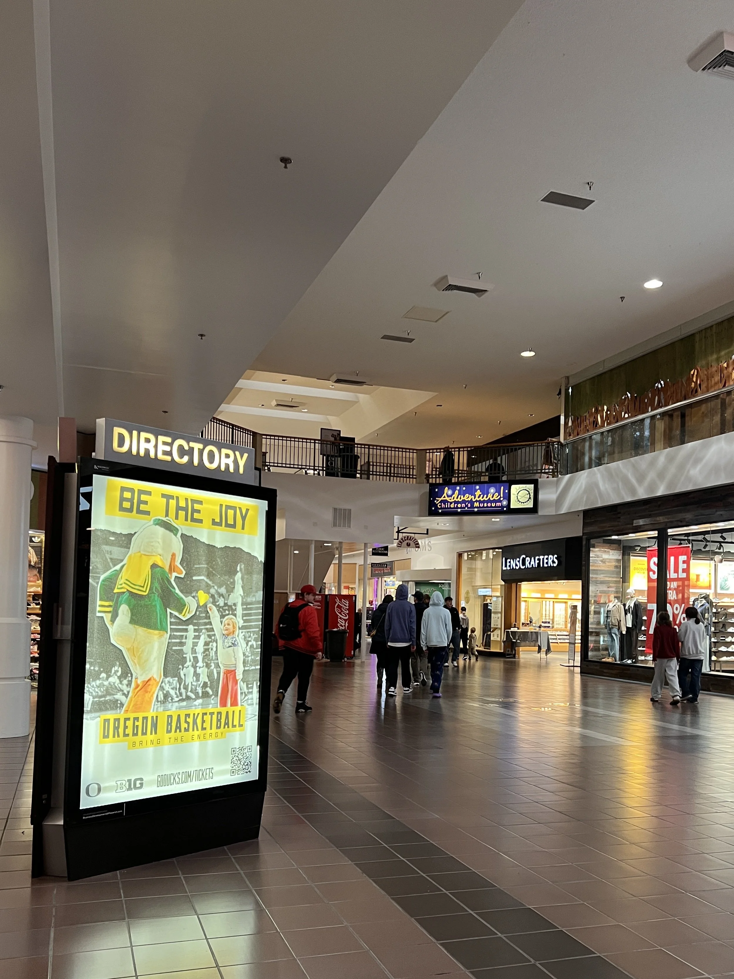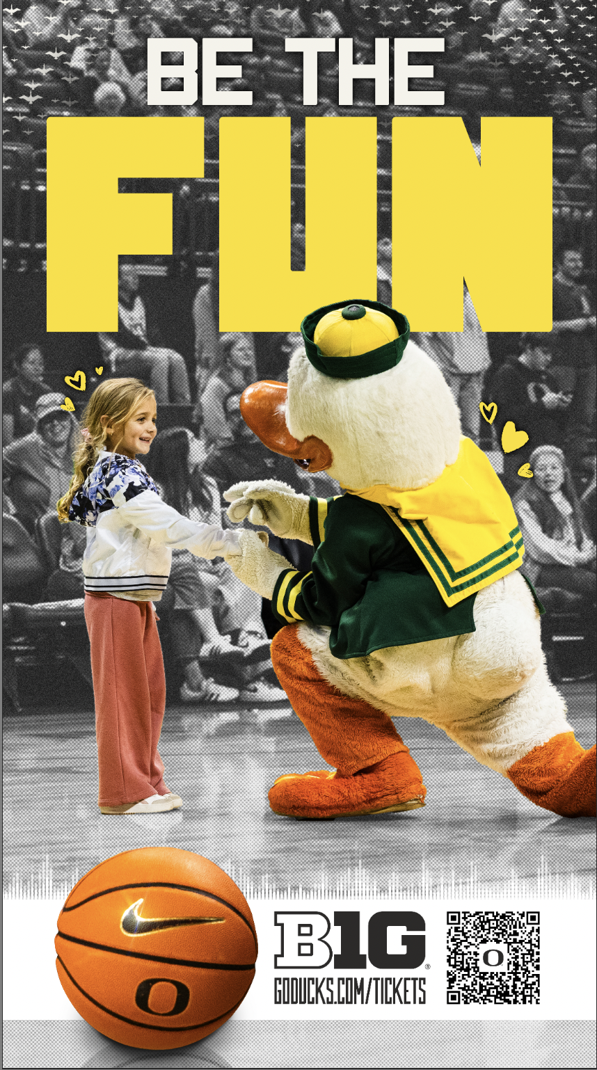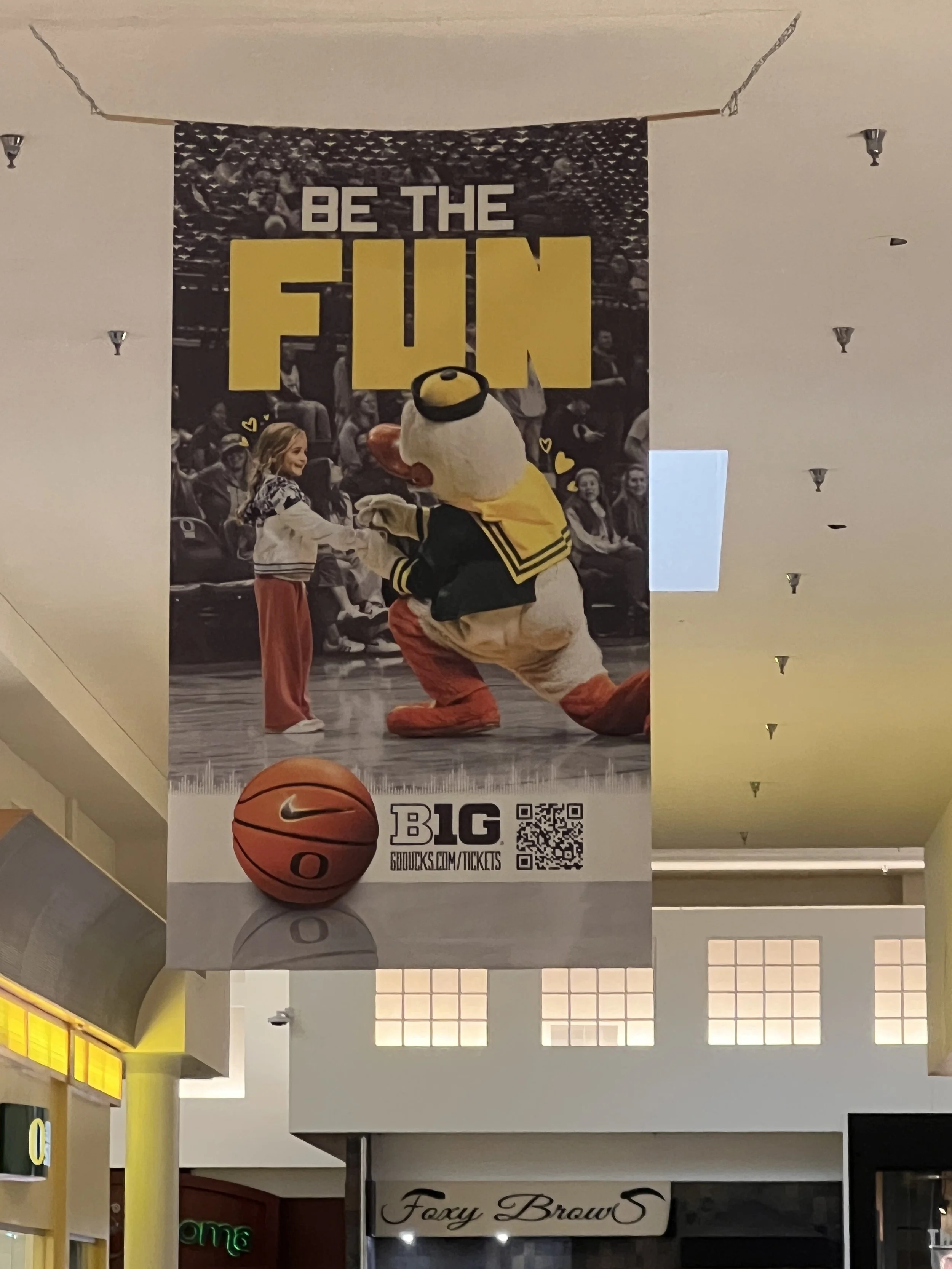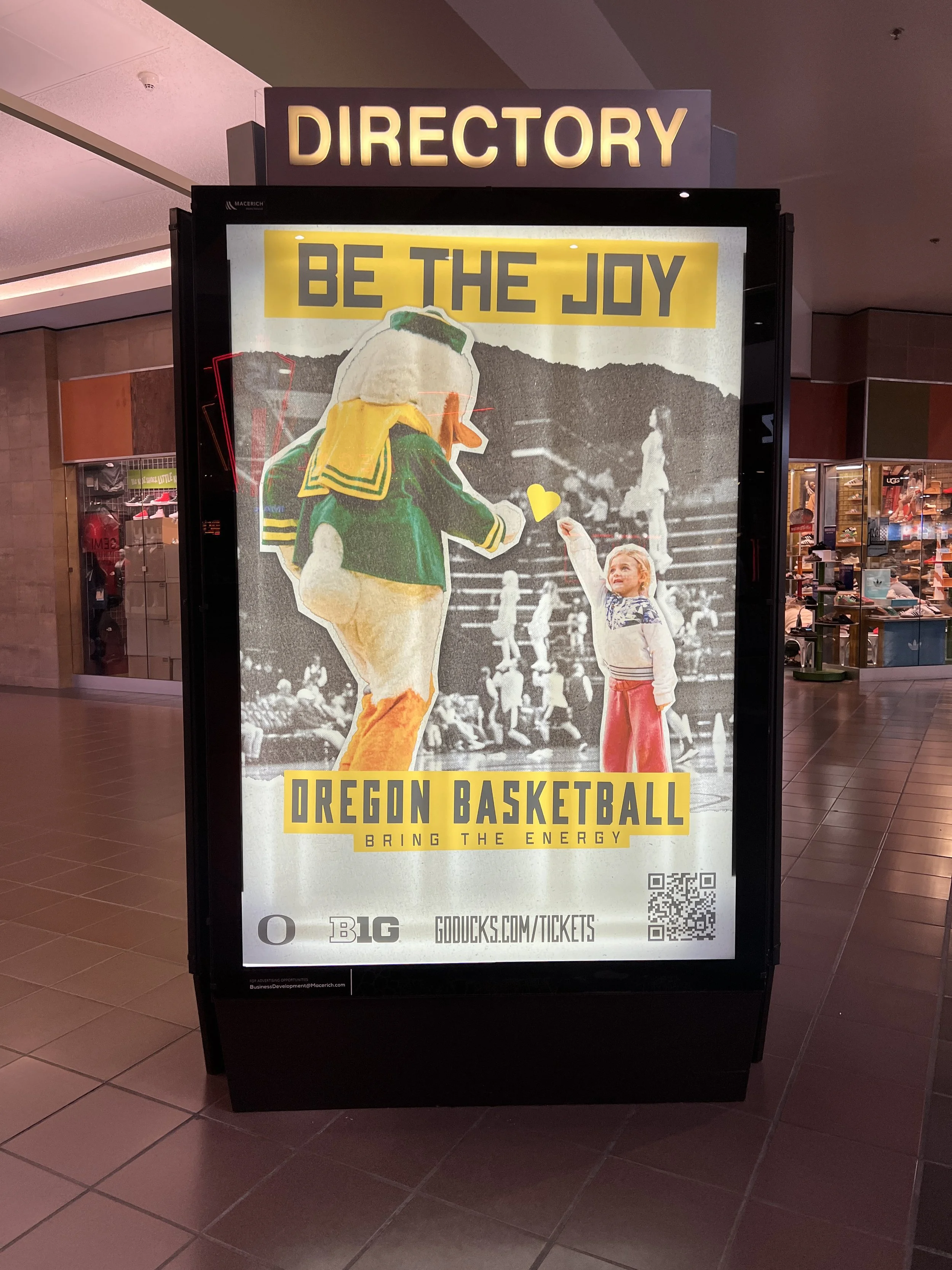 A loyal audience that deserves recognition are families with young Duck fans. Our mascot, Puddles, always does his best to engage with and inspire the next generation of basketball fans, so we decided to follow suit and establish the culture early. These banners, located throughout the local shopping mall, aimed to show the softer, more wholesome side of UO Basketball shenanigans.