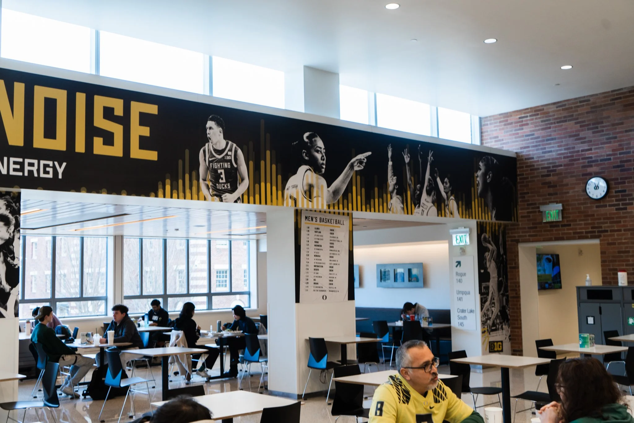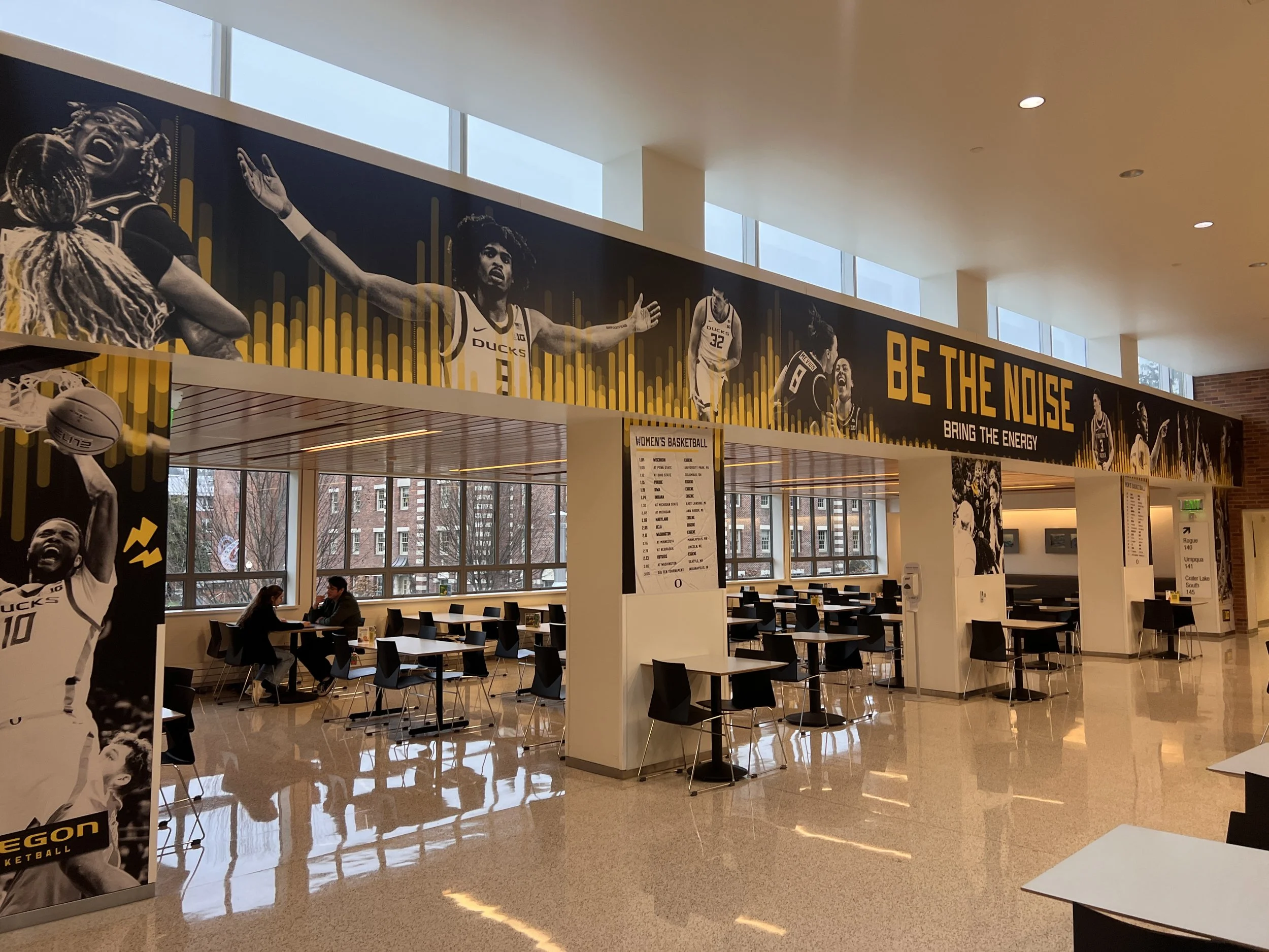 After a crushing defeat brought the end of our historic 2024 Football season, Duck fans were in search of something to put the wind back in their wings. Lucky for them, both UO basketball teams surged at the start of the season, remaining undefeated for an entire month. What did we do to support their efforts? We designed a 65 foot banner fit for the food court in the Erb Memorial Union, the center of student life on campus. The banner displayed a collection of the most emphatic, impassioned moments of the season thus far. The piece functioned as a window into the pandemonium of Matthew Knight Arena, serving as an open invite to join the madness. Read more about our process in this Daily Emerald Article.