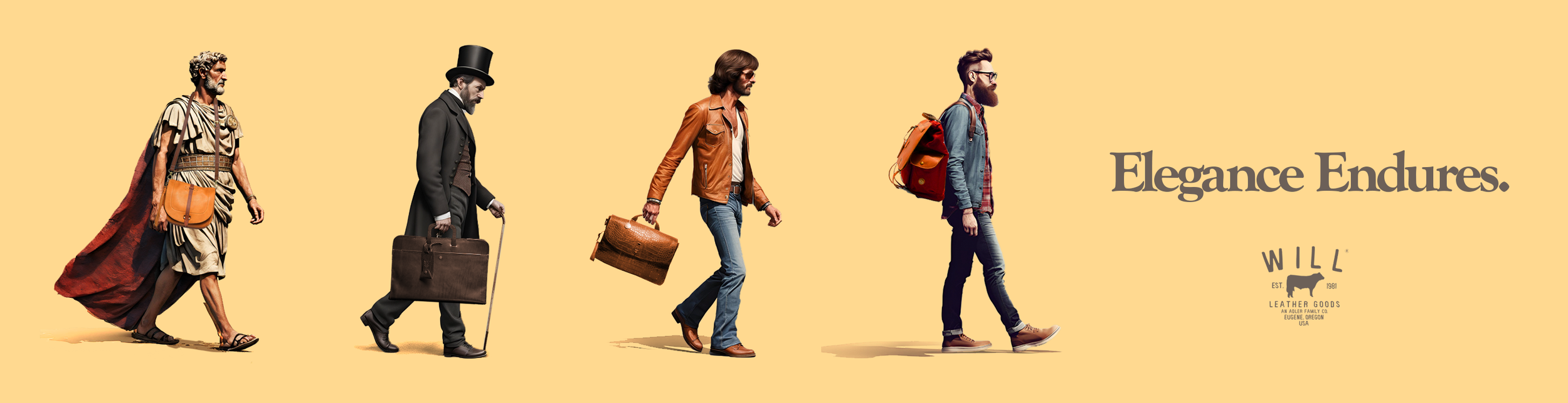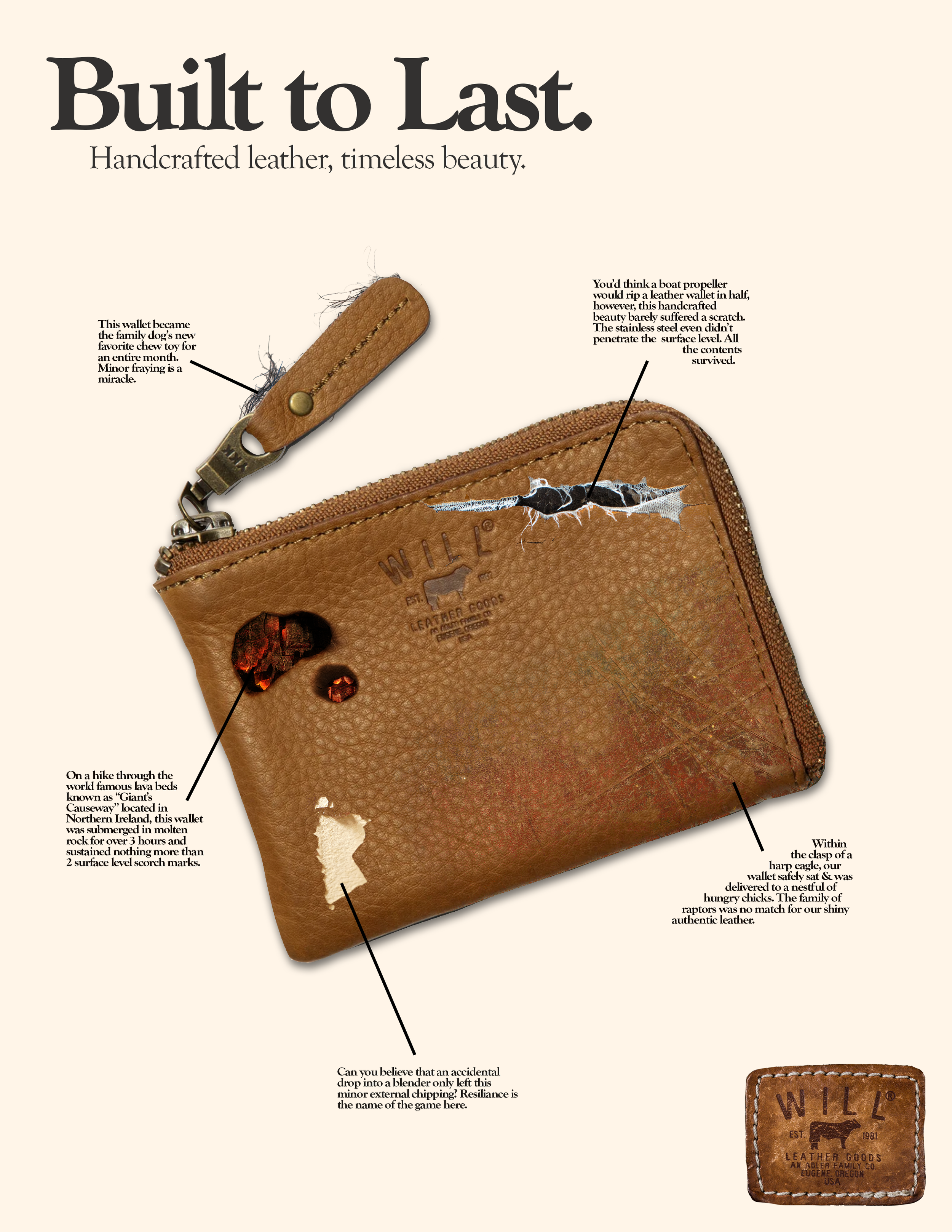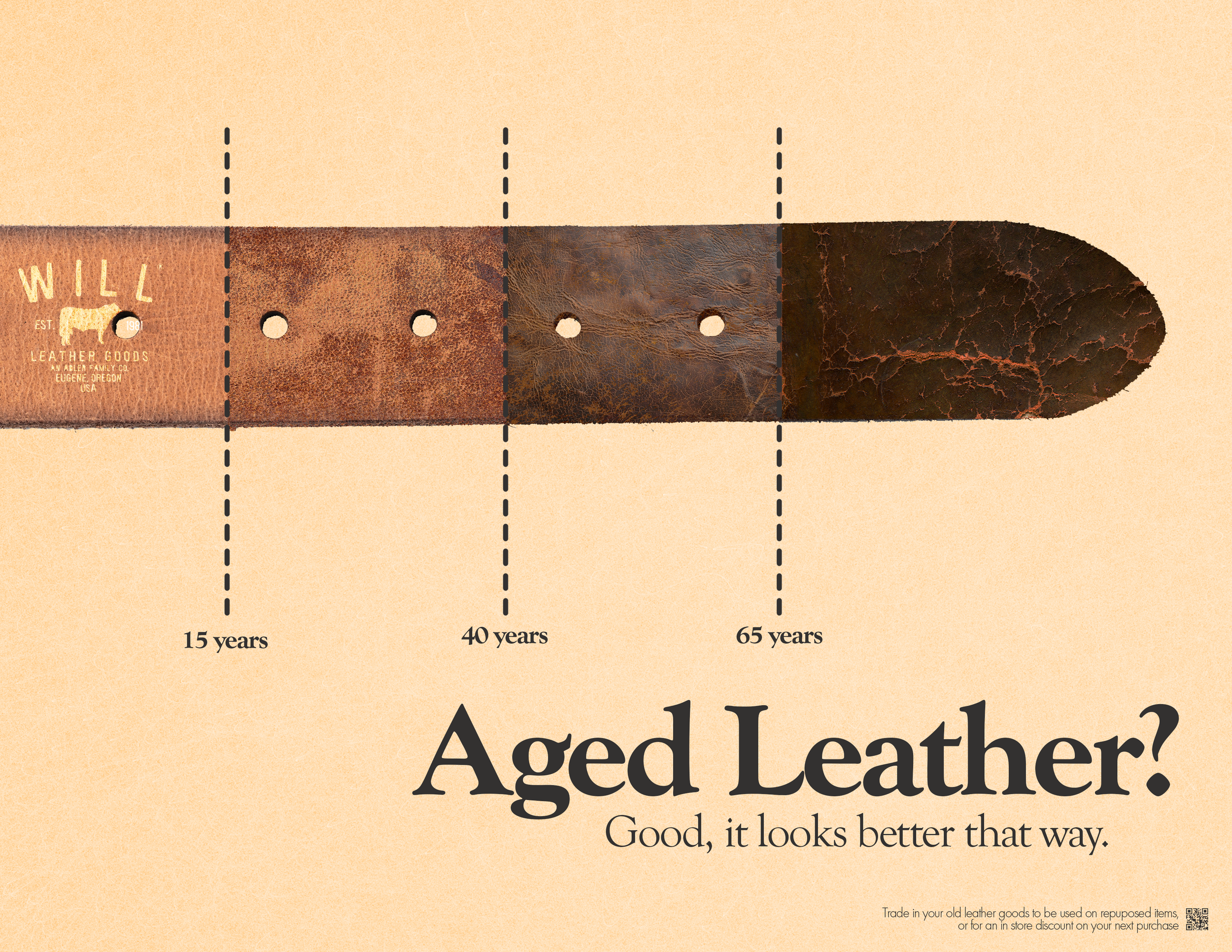 Leather goods are storied objects that we form a deep connection with over time. The print heavy wallet advertisement would occupy a bus shelter or magazine, helping readers think deeply about their relationship to their essential leather tools and garments, and whether they have stood the test of time. The other billboards visually represent the passing of time, with the constant throughout being Will Leather Goods. This reinforces the idea that our leather goods should age alongside us, like a friend. This concept appeals to upper-class people who take pride in the fine quality of their assets.